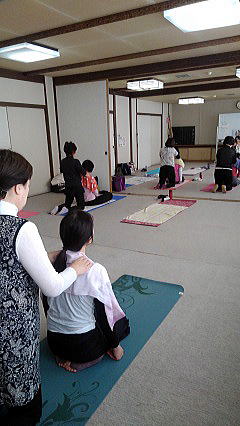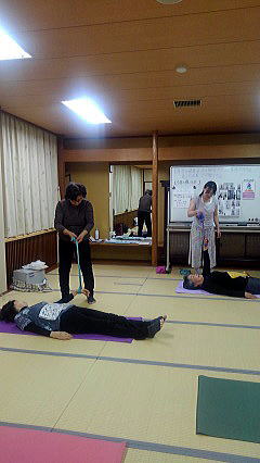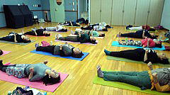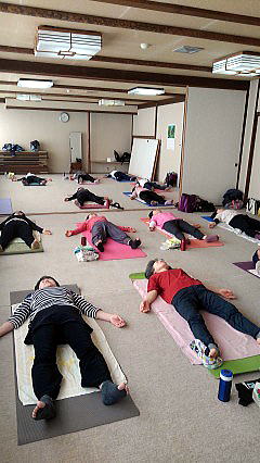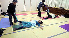 今月のレッスンでは、冷えを解消するポーズを中心に、ベルトを使ってストレッチをしたり、ホットタオルを使ってマッサージをしています。