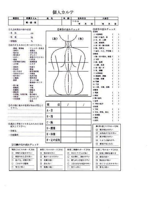 このカルテに首から足までの歪みをペアでチェックして書き込んでいきます。
