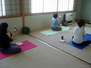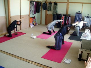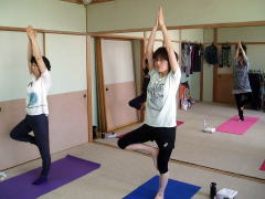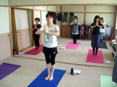 立ち木のポーズでお腹を引き上げ中。皆さんお上手です。