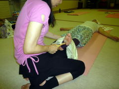 ペアマッサージで身体をほぐしているところ(左)と、足ツボ刺激で老廃物を排出しましょう!(右)