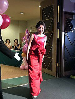 真っ赤なドレスに身を包み美女と野獣の音楽にのれい元谷先生入場!