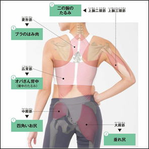 ぷよぷよ脂肪がつく場所は決まっているので、付随する筋肉を意識してポーズを行うだけで脂肪燃焼効果が高まります。(下図参照)