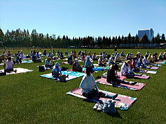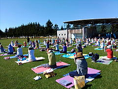 100名のヨギニ集合 クムバク呼吸法 肩こり解消のポーズ